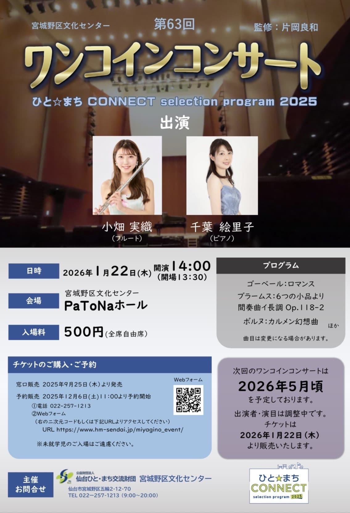 年が明けた2026年1月22(木)に宮城野区文化センターのワンコインコンサートに出演させていただきます✨
